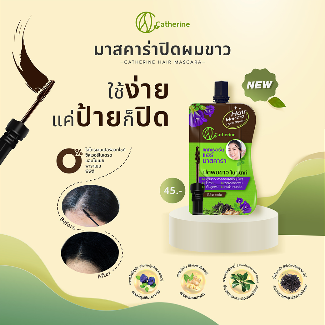 ขอแนะนำ แคทเธอรีน แฮร์ มาสคาร่า สีน้ำตาลเข้ม . . ขนาดใหม่ ผลิตภัณฑ์ปิดผมขาวที่พกพาสะดวก ใช้ง่าย แห้งไว ล้างออกได้ด้วยแชมพู